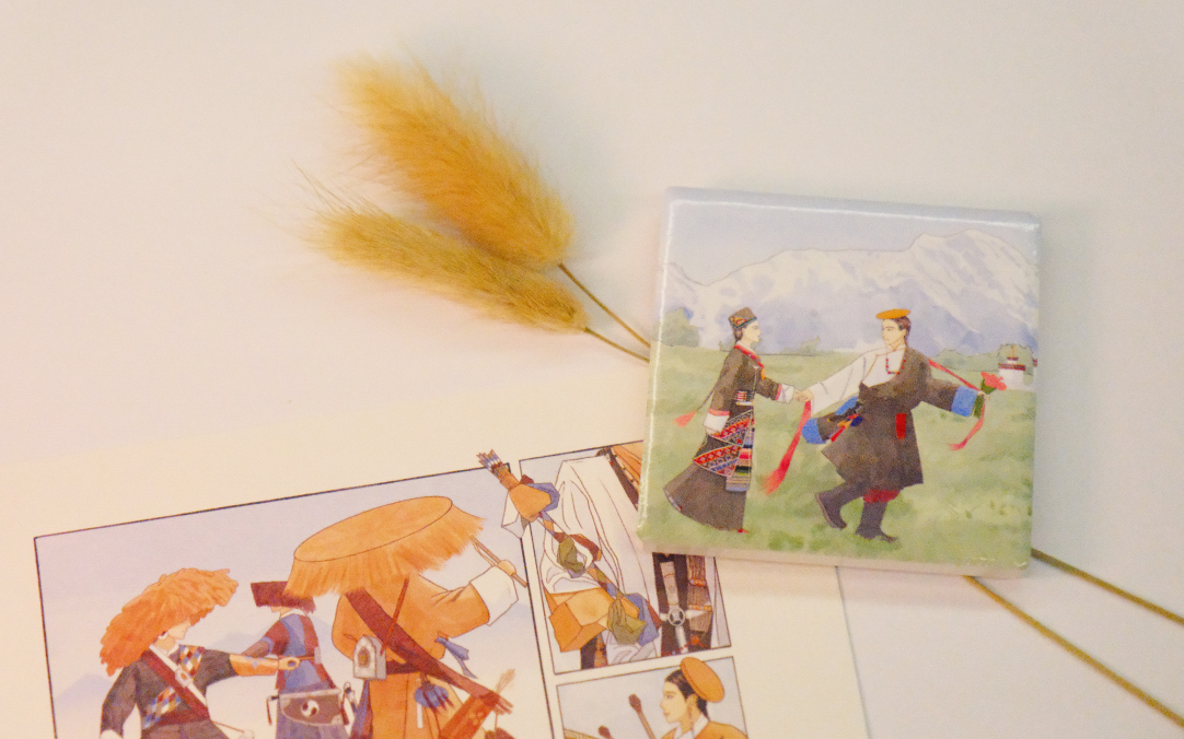 チベットの若手アーティスト「旖蔵絵(イザンエ)」とのコラボで、後蔵地域の伝統的な祭りや風俗を描いた絵画を基に、冷蔵庫マグネットやステッカーなどの文創製品を制作。売上の一部は、伝統工芸の保護活動に活用されます。